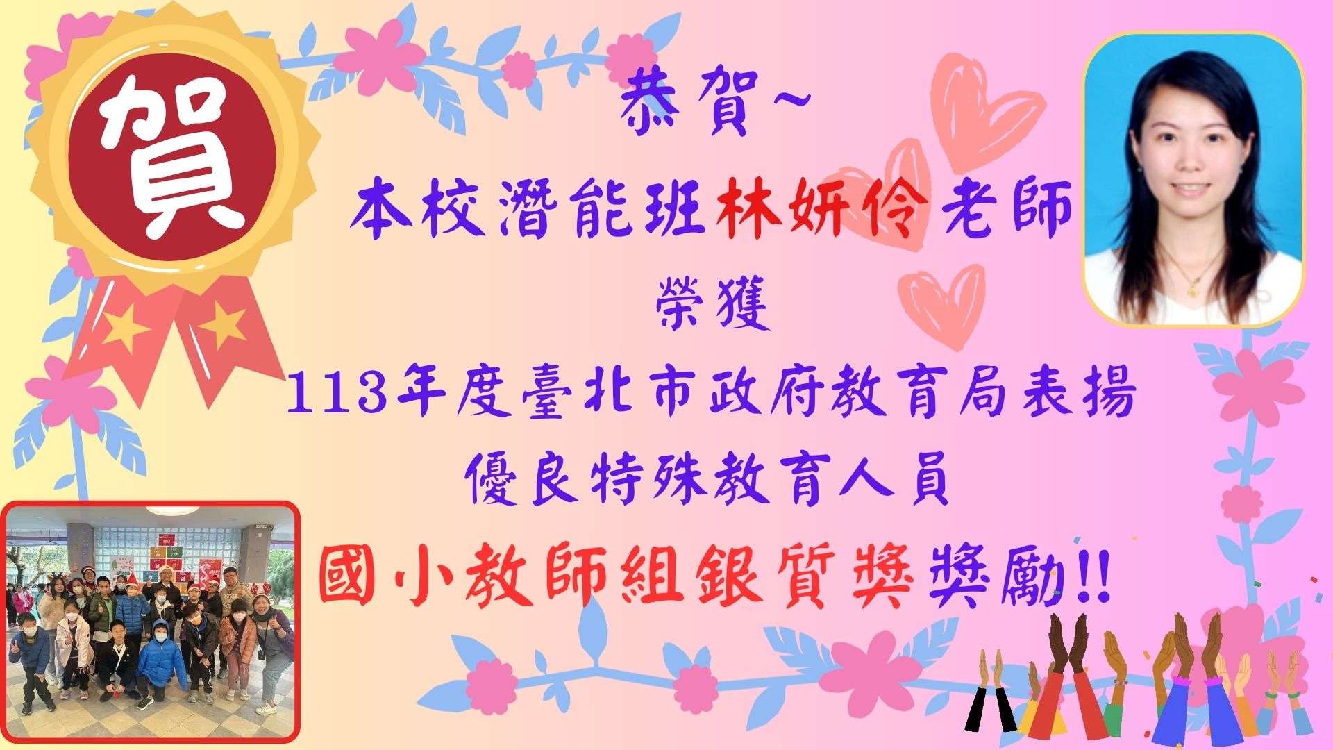 恭賀~本校潛能班林妍伶老師榮獲113年度臺北市政府教育局表揚優良特殊教育人員國中小及幼兒園教師組<銀質獎>殊榮,優良表現值得肯定!!