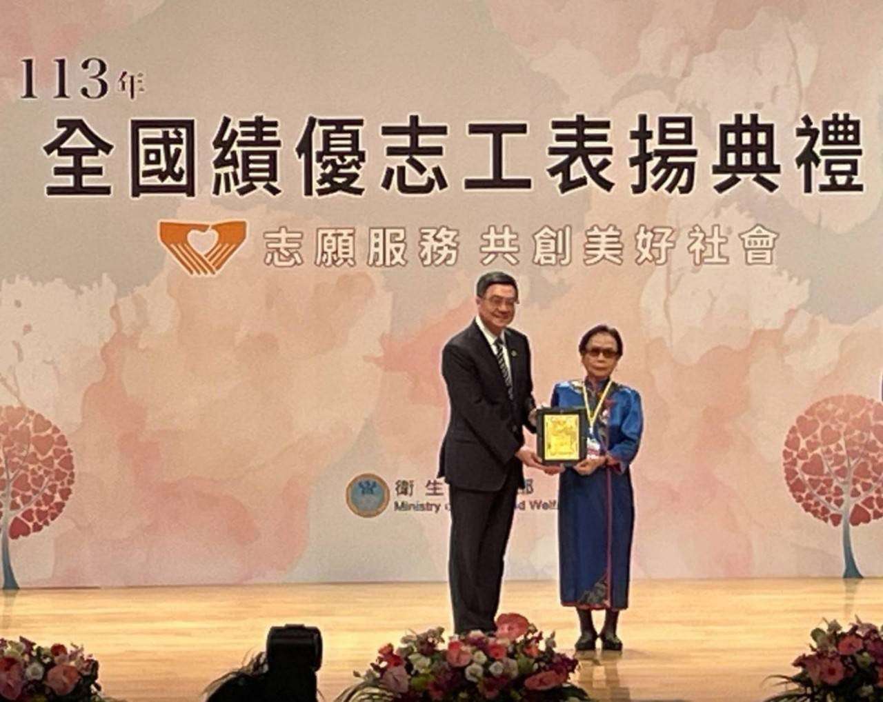 恭賀本校導護志工胡李素霞女士榮獲113年度《衛福部志願服務績優金牌獎》殊榮(由另一主要志工服務單位推薦申請),於113年11月17日參加113年全國志工表揚典禮接受頒獎表揚,感謝胡李素霞女士積極參與志工服務、奉獻心力,認真付出辛勞值得肯定和嘉許👍!