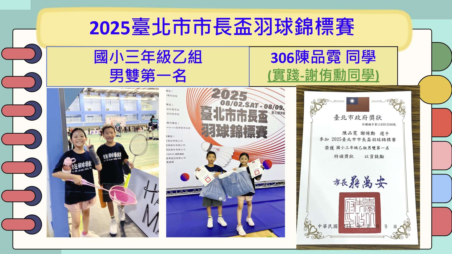 恭賀306班陳品霓同學參加2025臺北市市長盃羽球錦標賽,榮獲國小三年級組乙組男雙第一名,表現優異值得肯定!!