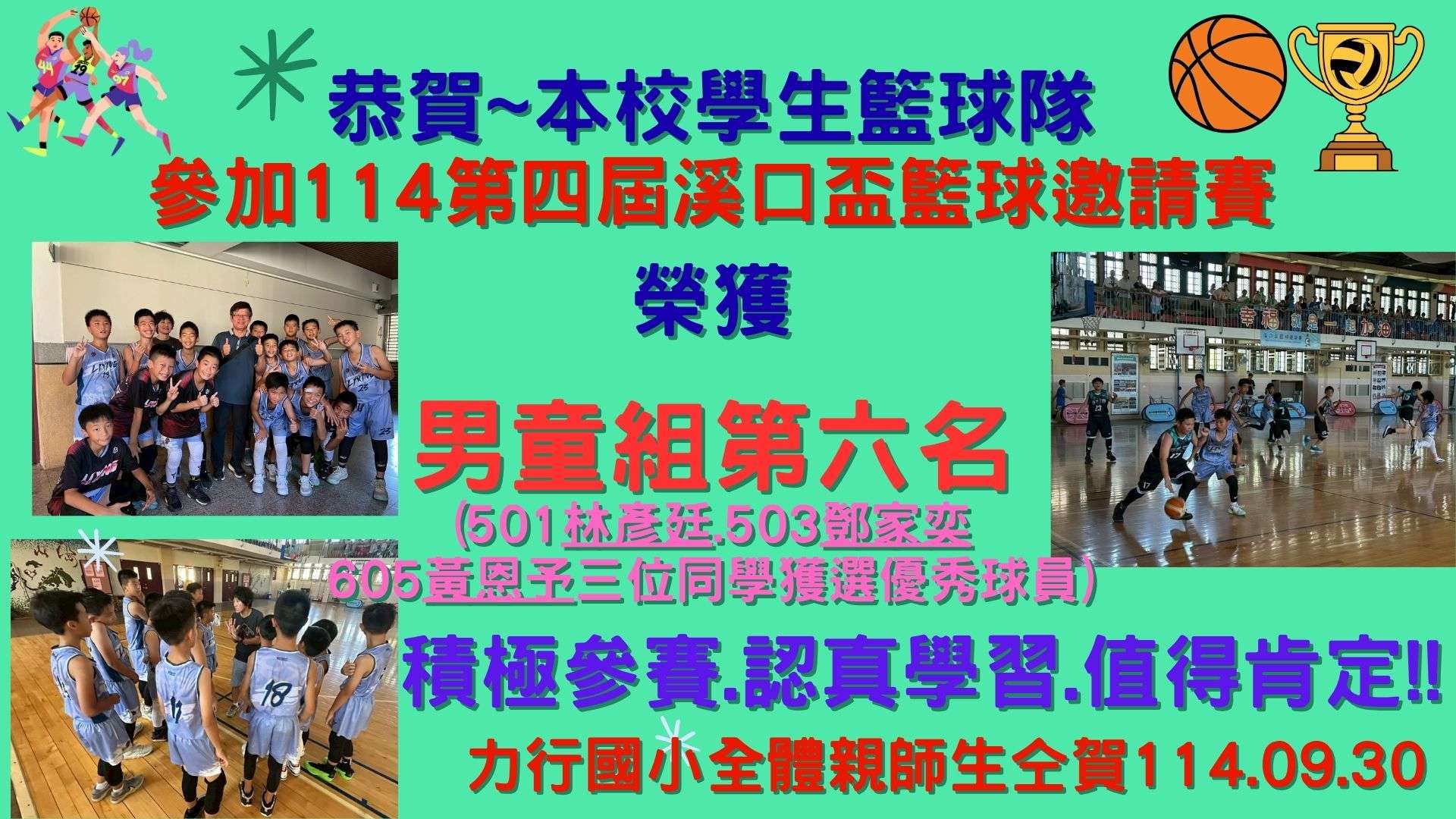 恭賀本校學生籃球隊參加【114年度第四屆溪口盃籃球邀請賽】榮獲男生組第六名(三位選手獲優秀球員)~