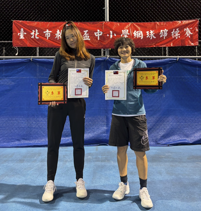 恭賀本校吳宜津老師與民權國小蔡郁辰老師組隊參加臺北市教育盃中小學網球錦標賽,榮獲硬網女子教師組雙打季軍!