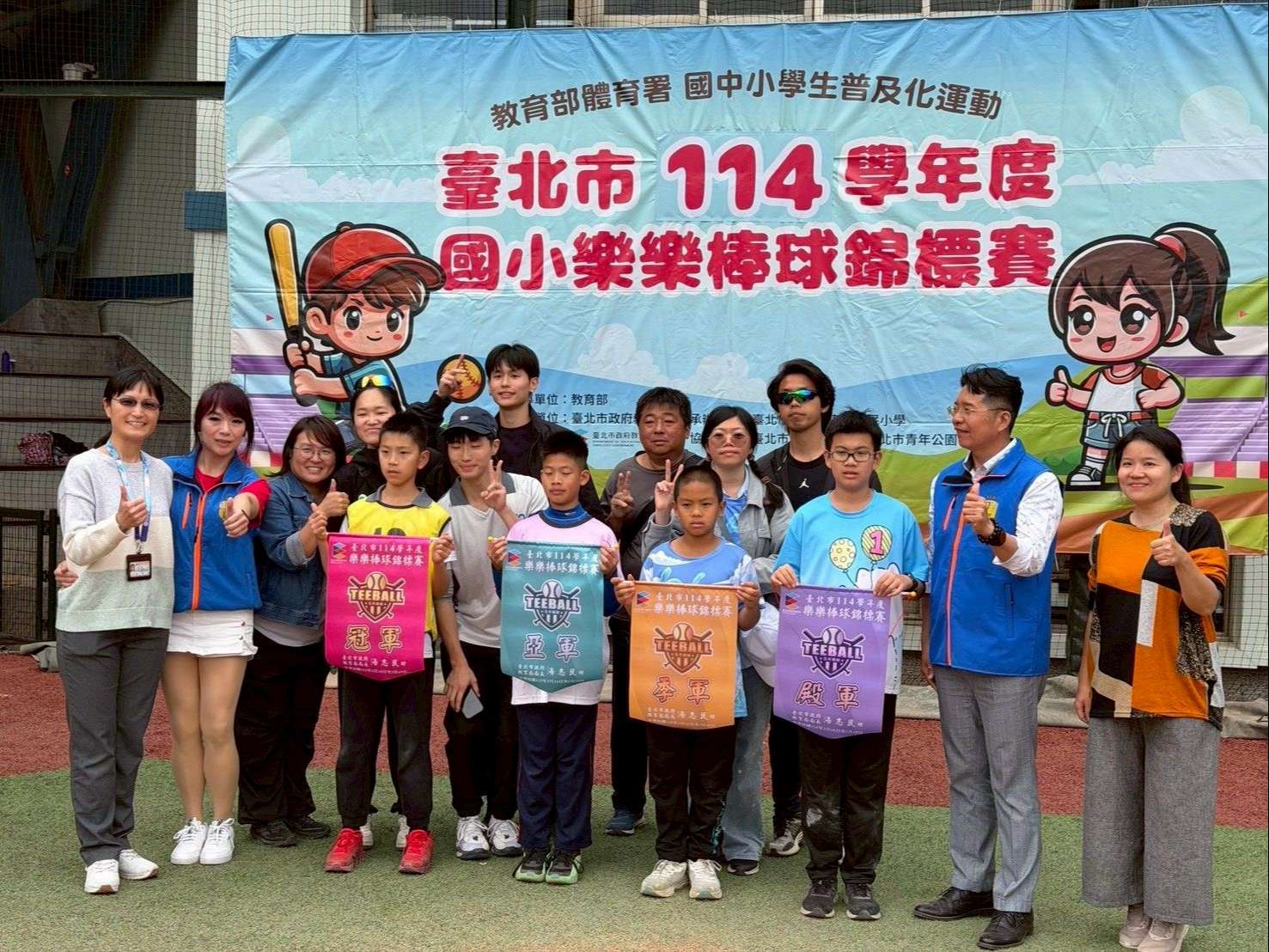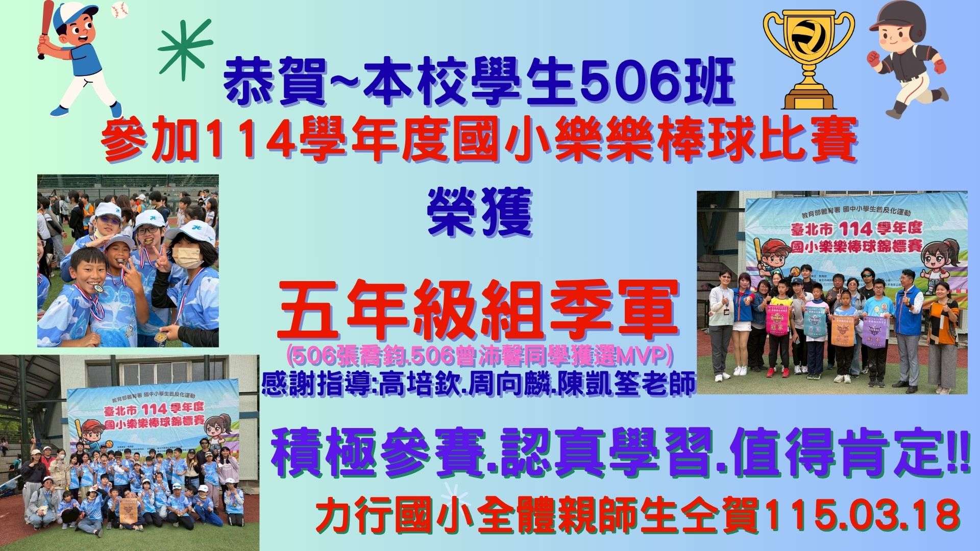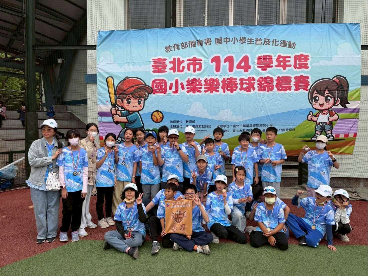 恭喜本校506班師生參加臺北市114學年度國小樂樂棒球錦標賽榮獲「季軍」殊榮,奮戰不懈、努力參賽👍,值得肯定和表揚嘉許!謝謝🙏高培欽老師、周向麟老師、陳凱筌老師用心指導和帶領、家長用力支持和小朋友們積極參賽,成果與大家分享!506張喬鈞同學及曾沛馨同學亦榮獲MVP獎勵,團隊及個人獎項,另將擇期於本校運動會時公開頒獎表揚鼓勵。